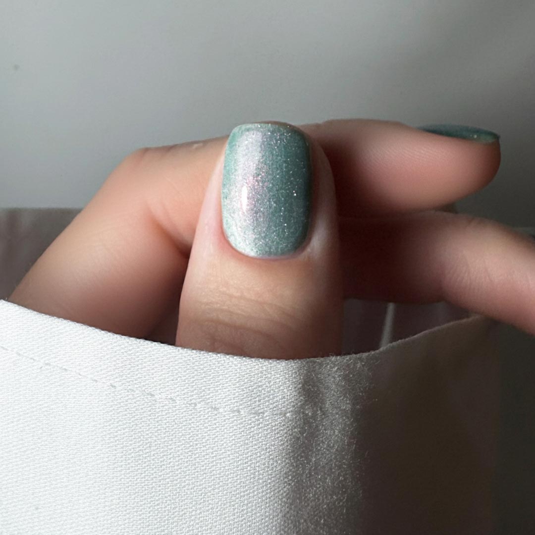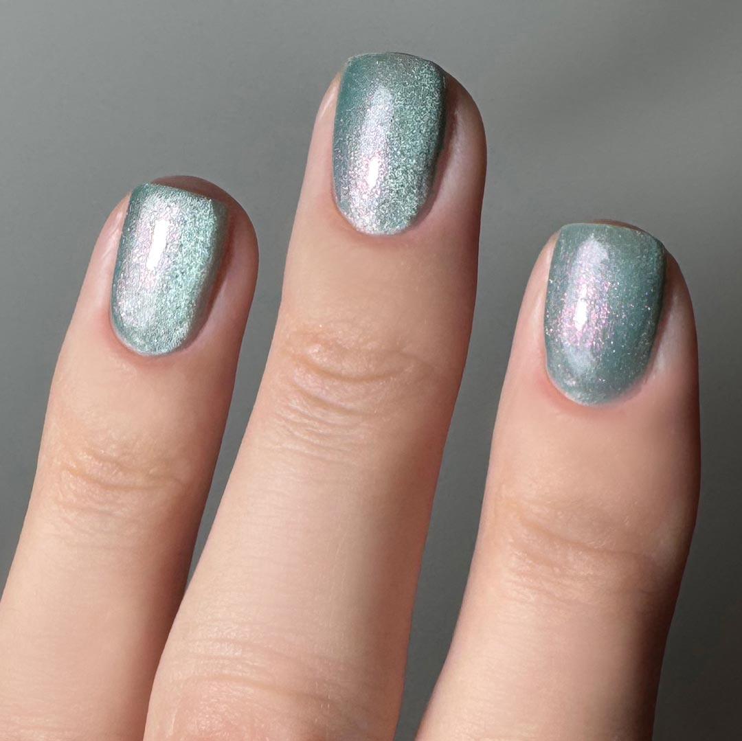 A shimmering teal-blue shade that captures the essence of ocean depths. When activated with the TWENTY Dual Ended Cat Eye Magnet Tool, it transforms into an iridescent cat eye effect that shifts beautifully with the light — from soft aquatic shimmer to striking, dimensional glow.