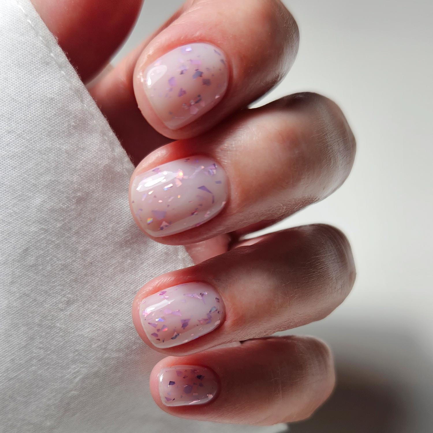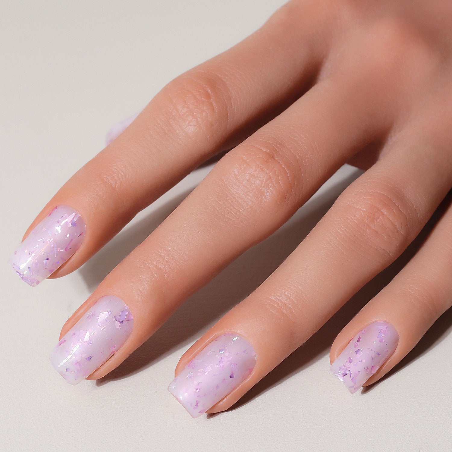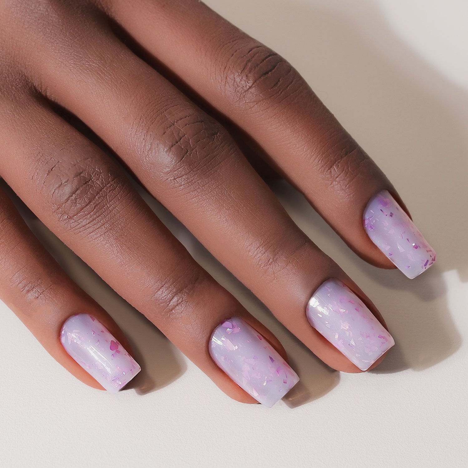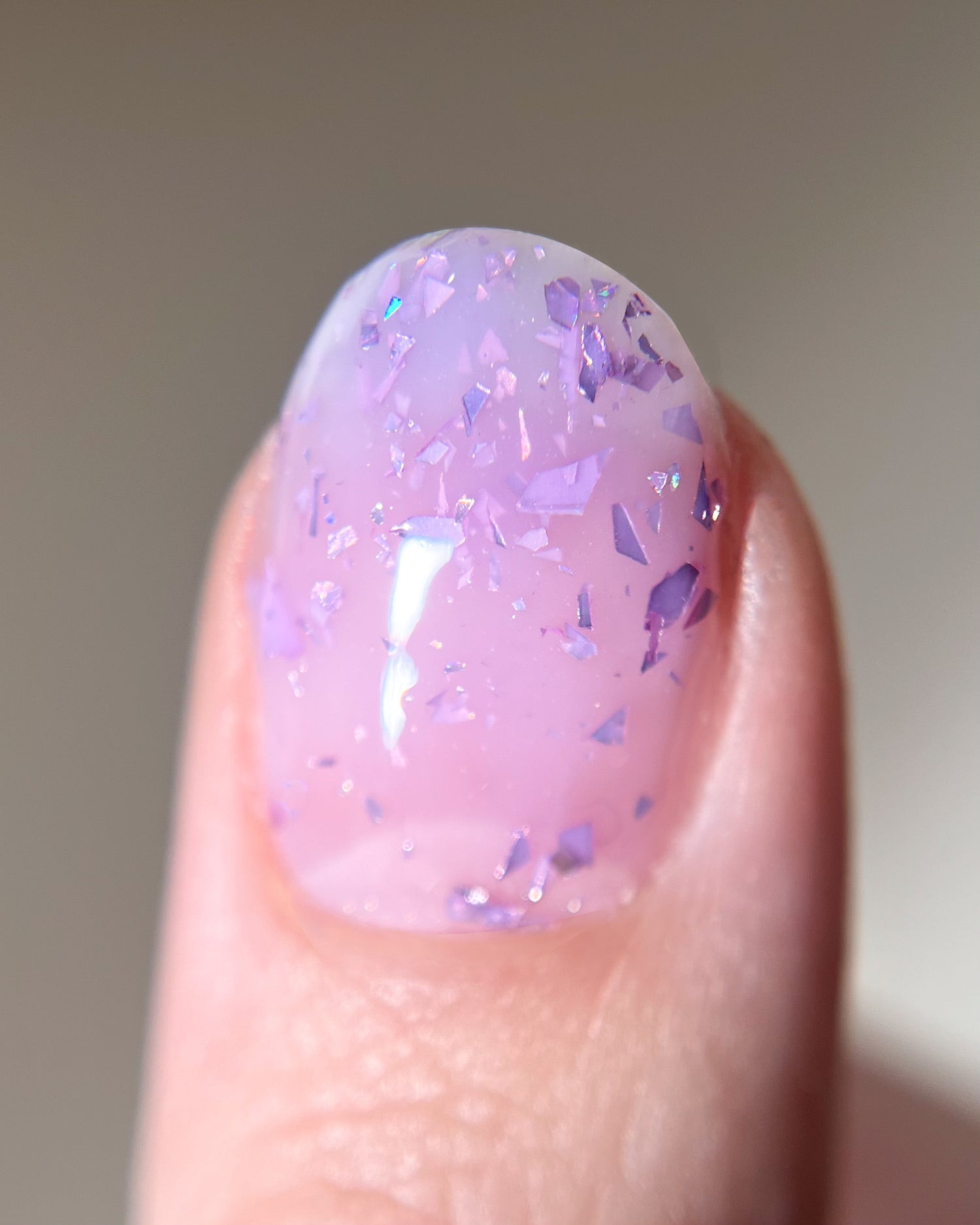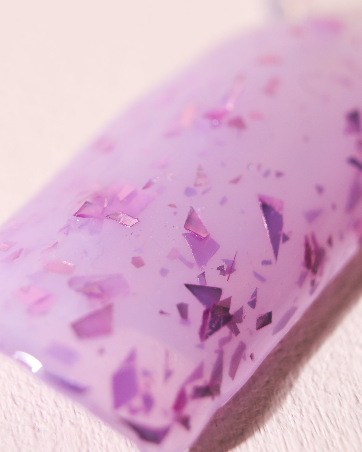 Celestial is an out-of-this-world gel, with a soft pastel lilac base and delicate shards of light pink and purple foil flakes. It's truly a sight to behold!