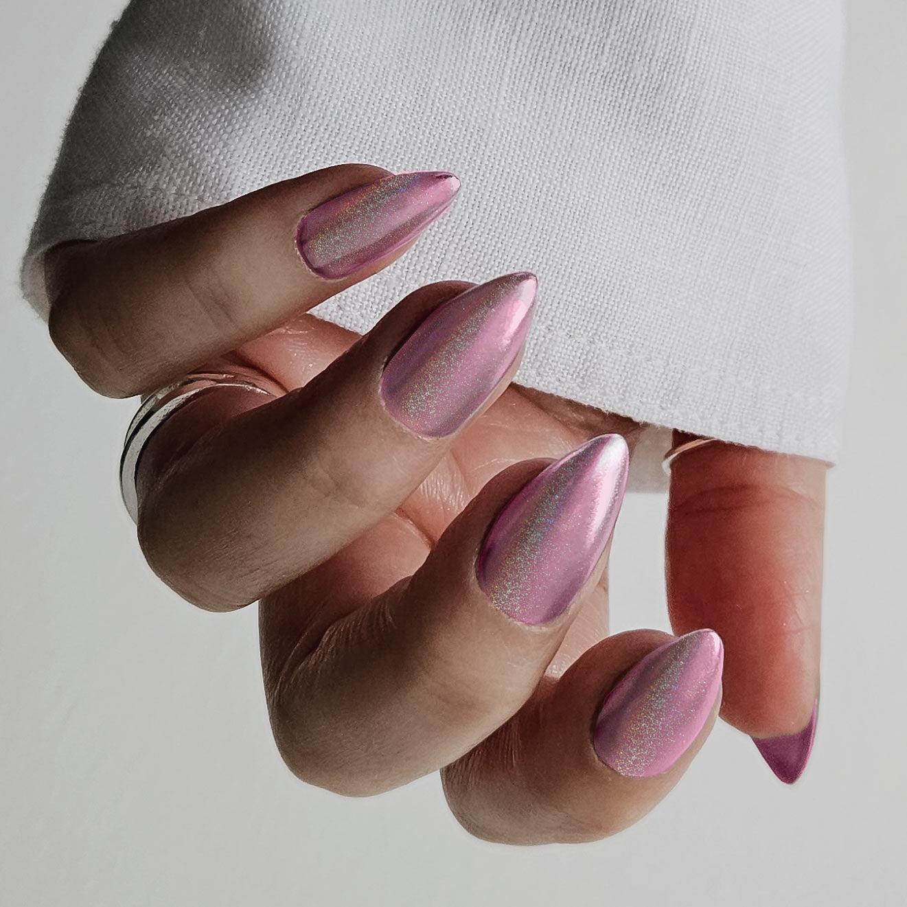A holographic chrome, Flashed has a candy pink base shade with an iridescent, spectrum finish.