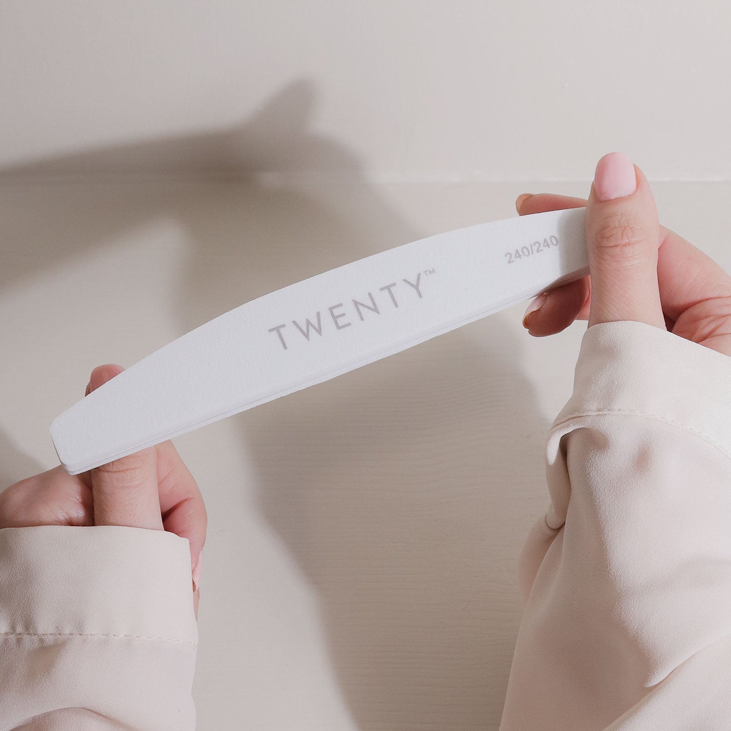 The TWENTY™ 240 grit double sided buffer is perfect for prepping the natural nail for gel application. Lightly buff away any imperfections and remove the shine of the nail before applying base coats or BUILD & BOOST™ for a long lasting, flawless finish.