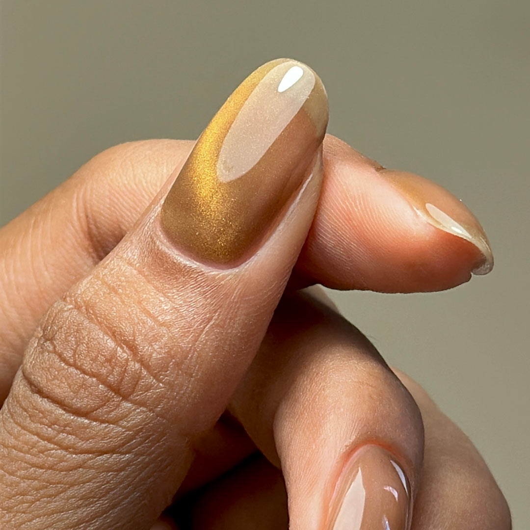 Golden, glossy, and full of dimension, Caramel Cat Eye is a semi-opaque magnetic shade that brings warmth and luxury to every manicure. With its molten honey tones and signature cat eye effect, this shade shifts beautifully under the light, creating a soft, glowing highlight across the nail.