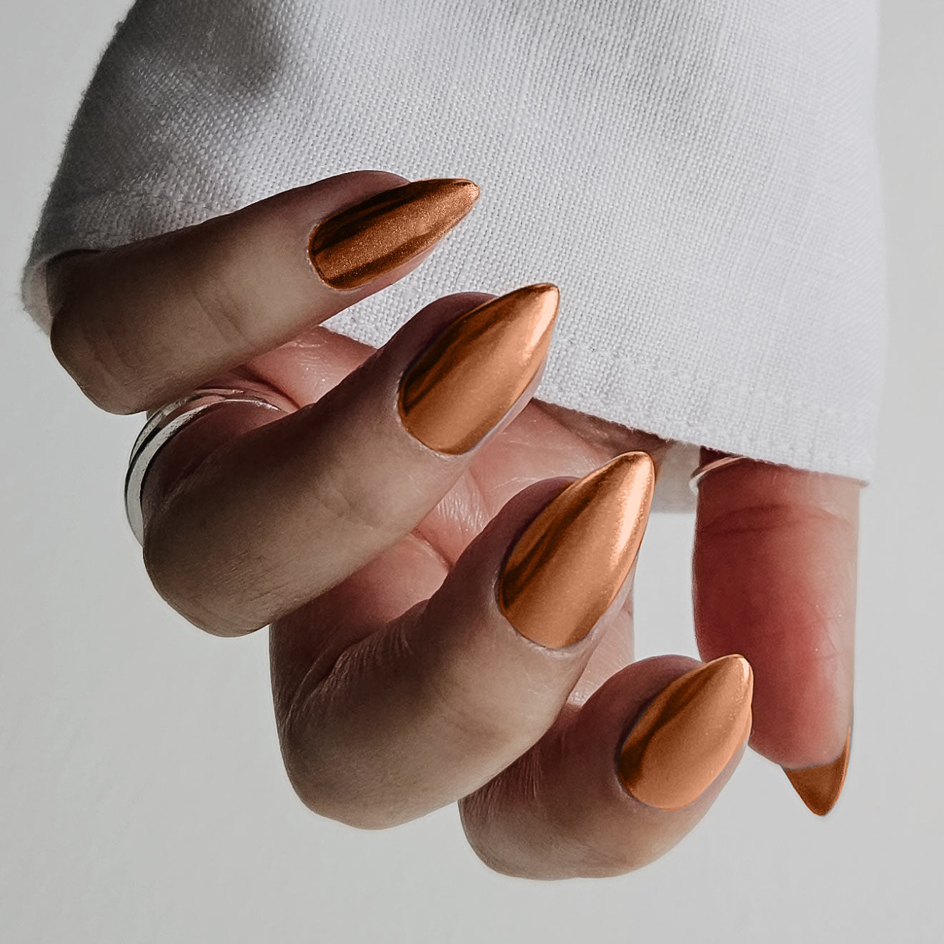 A muted copper chrome that gleams like a newly-pressed penny coin. Pair with deep browns for a rich, decadent look.