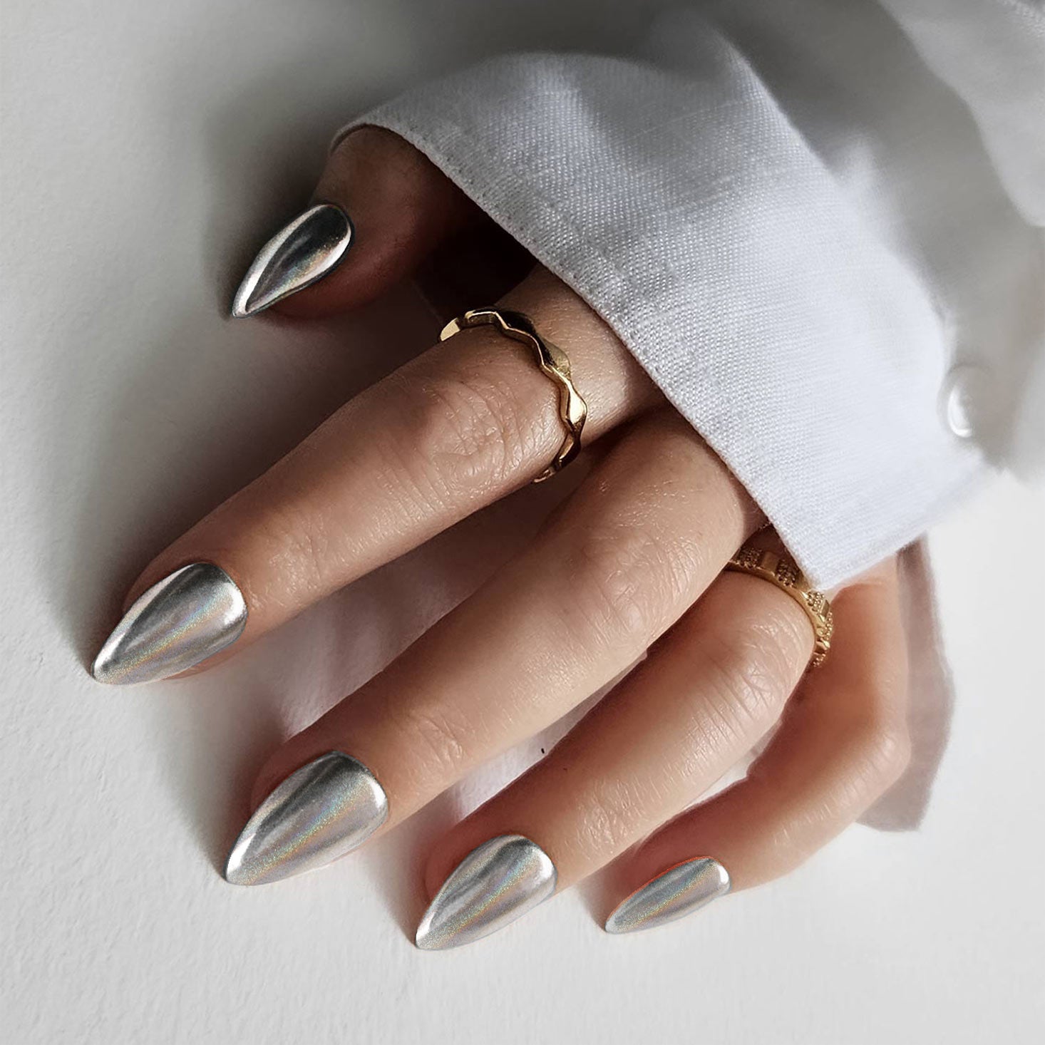 A holographic chrome, Futurist has a light silver chrome base shade with an iridescent, spectrum finish.